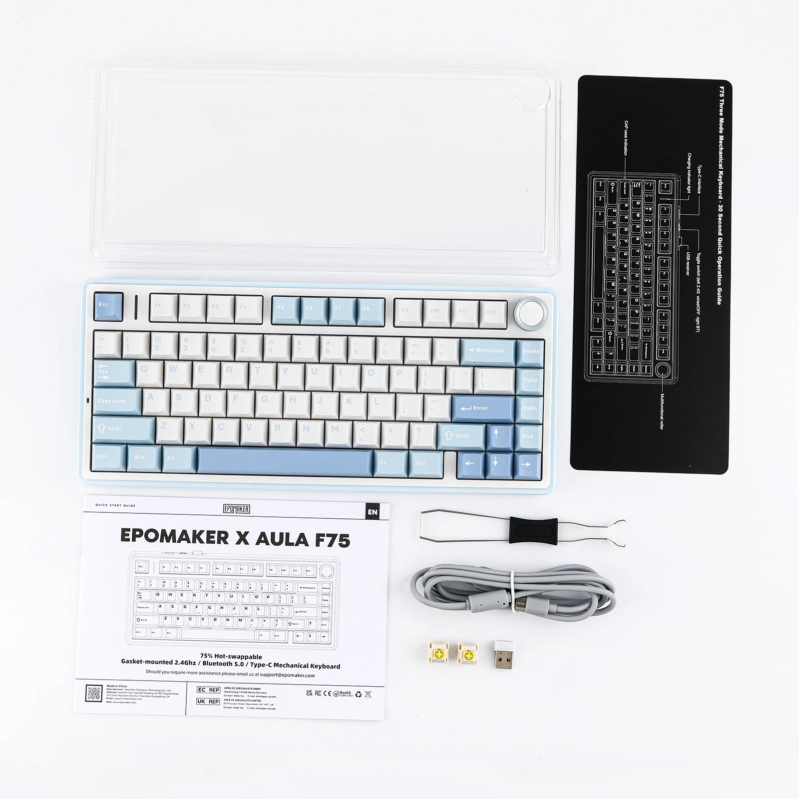 Offering Bluetooth, 2.4GHz wireless, and wired USB connectivity, the F75 adapts to your specific needs. Whether it's for a clutter-free wireless setup or a stable wired connection, this keyboard is ready for any situation.Equipped with a large 4000mAh battery, the F75 delivers extended usage times. This generous battery capacity ensures that your keyboard is always ready for long work sessions or intense gaming marathons.